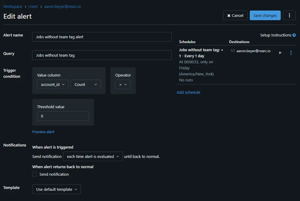 Once you've written your query in the SQL editor, you can save it and create an alert under the “Alerts” tab. This allows you to receive automated email notifications when certain conditions are met — such as jobs missing the team tag. The example alert shown below runs every Friday and sends an email if at least one job is found without the required team tag.